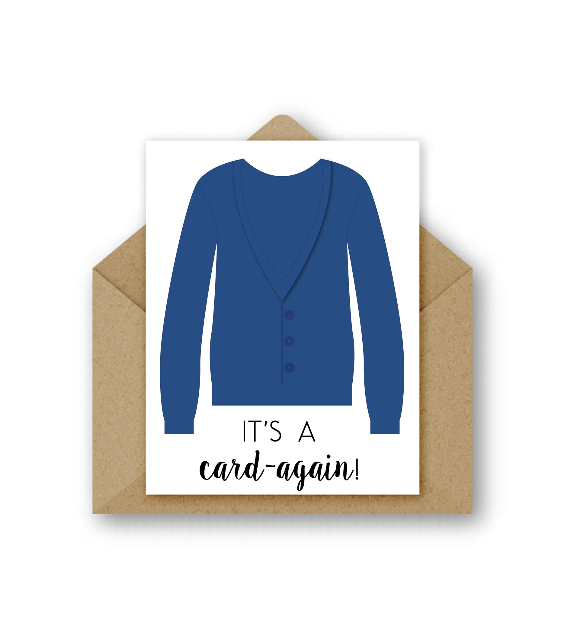 With a simple yet charming illustration of a cardigan and the witty message, 'It's a card-again!' this card is a delightful way to share your thoughts and make someone's day brighter.