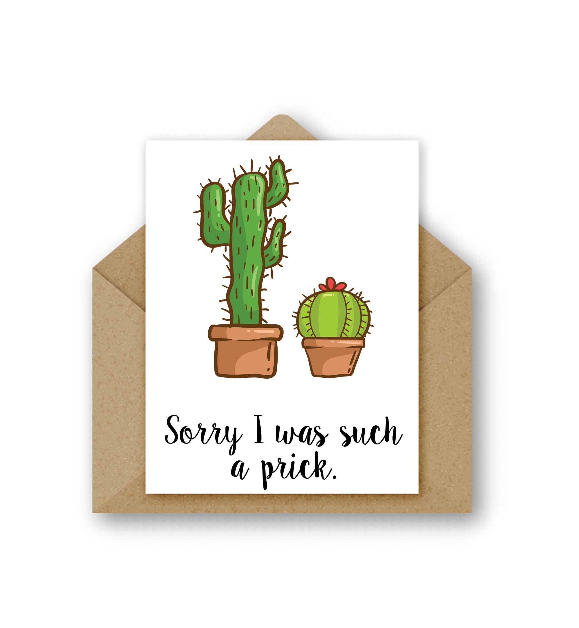 Featuring a charming illustration of two cacti and the witty message, 'Sorry I was such a prick,' this card is a fun and memorable way to say sorry.