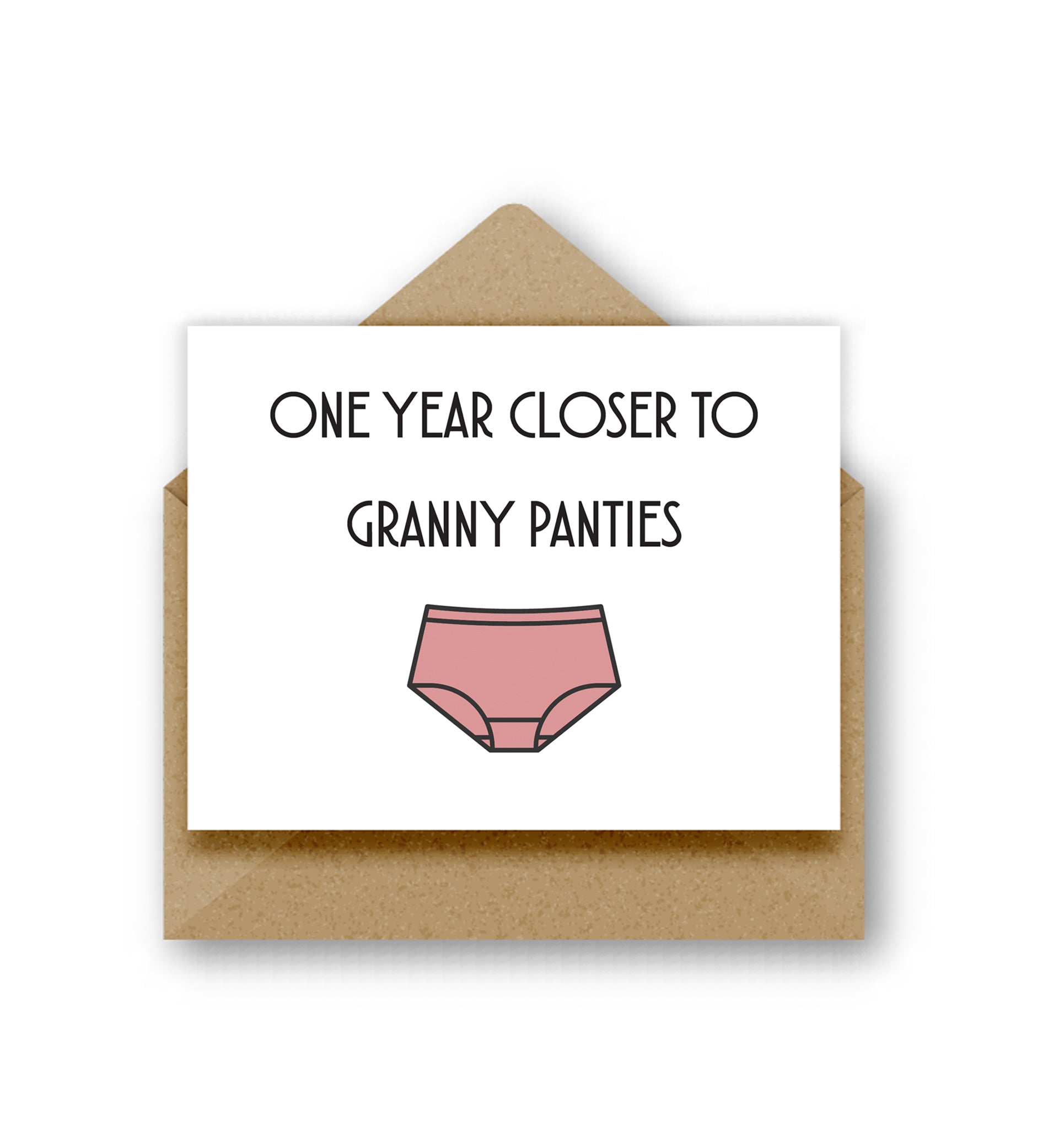 Featuring a playful illustration of granny panties and the bold message, 'One Year Closer to Granny Panties,' this card is sure to bring a smile (and maybe a blush) to the birthday person’s face. It’s a fun way to acknowledge the inevitable while keeping the mood light and playful.