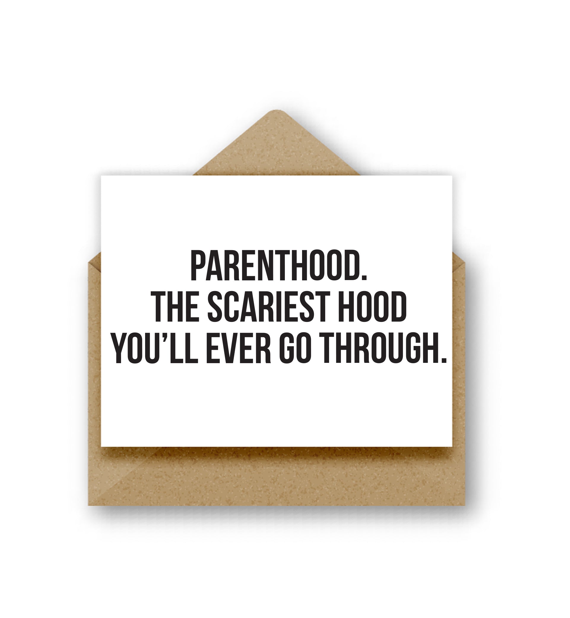 Featuring a bold, minimalist design with the playful message, 'Parenthood. The scariest hood you’ll ever go through,' this card is a memorable way to share a laugh and some heartfelt support.