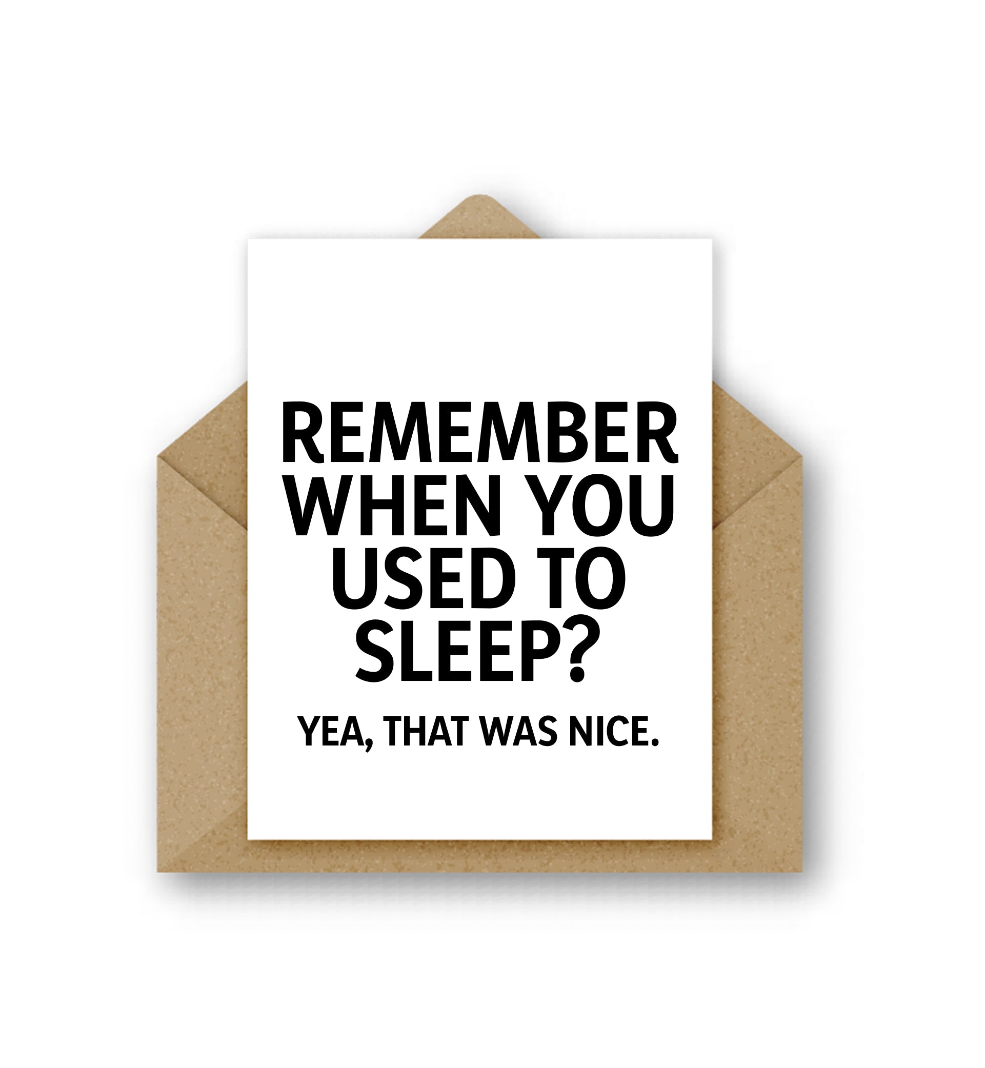 Featuring a bold and straightforward message, 'Remember When You Used to Sleep? Yea, That Was Nice,' this card is a fun and relatable way to bring a little laughter to someone’s sleepless nights.