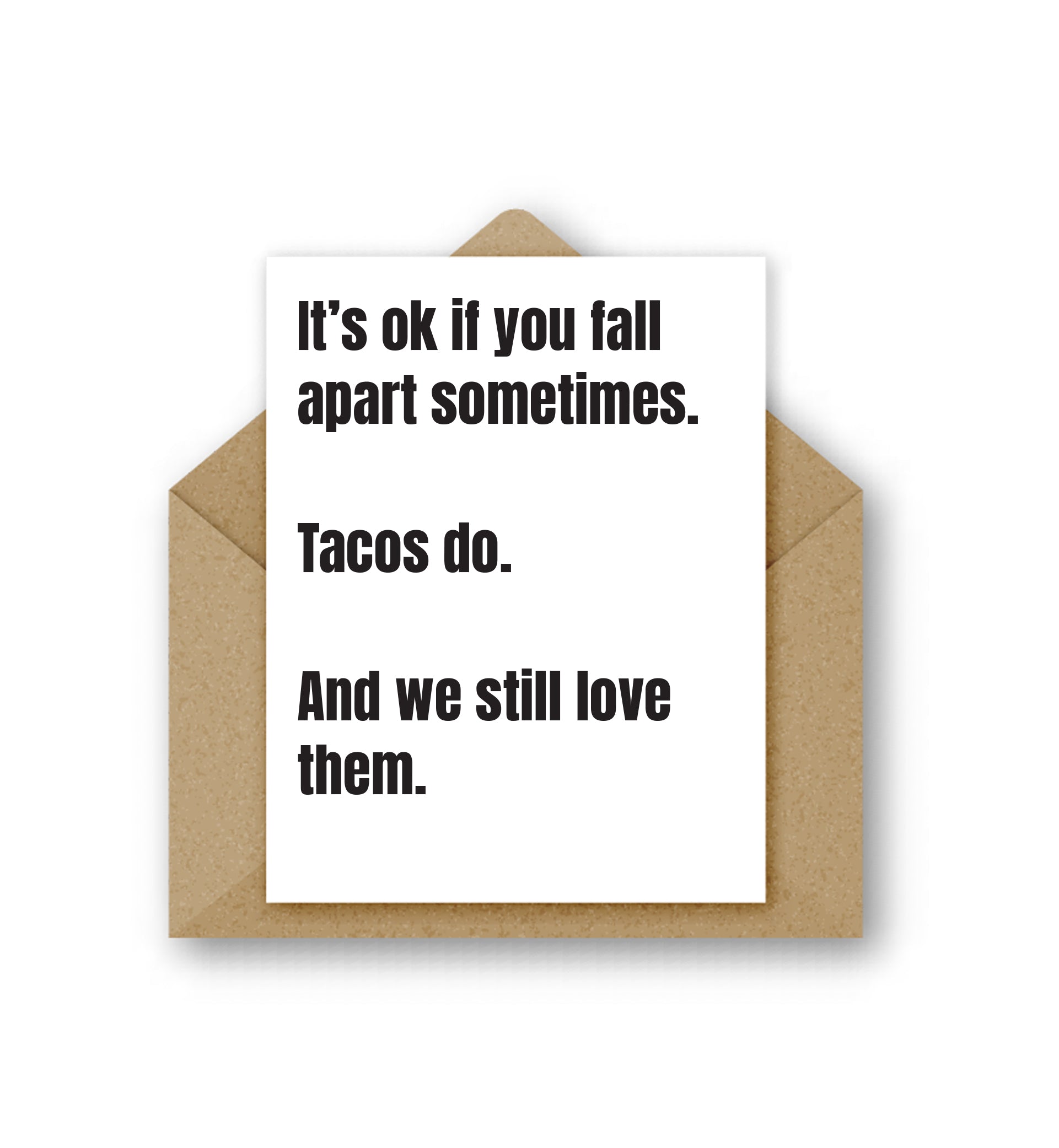 Sometimes, life gets messy, and that's okay. Our It's OK If You Fall Apart Sometimes greeting card is here to remind your loved ones that even when things fall apart, they are still loved—just like tacos.