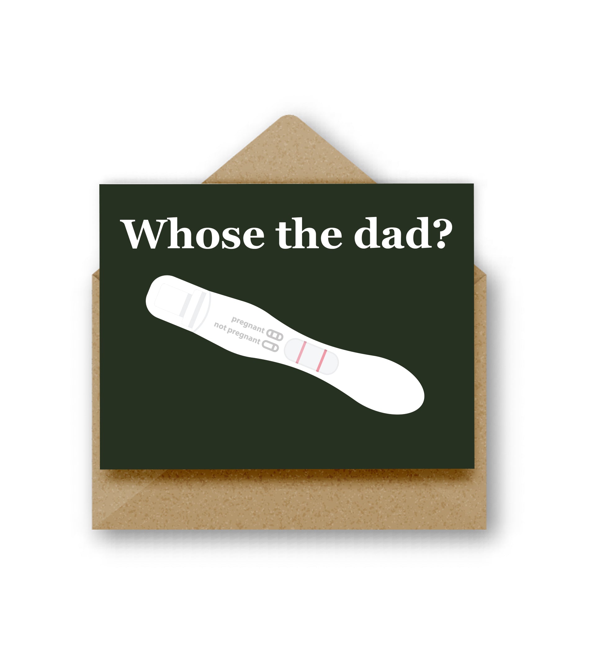 Featuring a minimalist design with a pregnancy test illustration and the cheeky question, 'Whose the Dad?' this card humorously adds a twist that’s sure to spark some laughs (and maybe a few raised eyebrows).