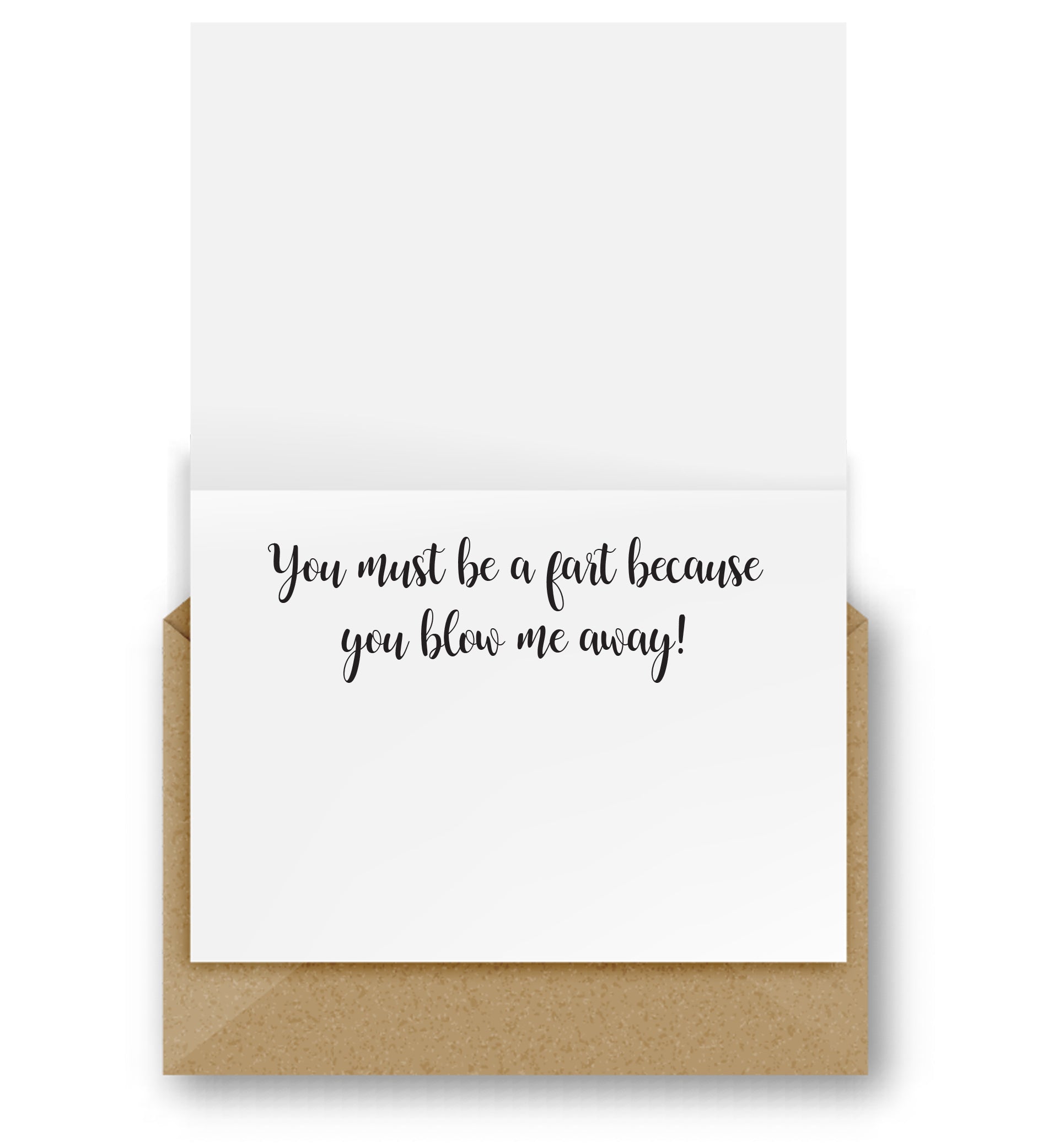 Add a little laughter to your love life with our You Must be a Fart Because You Blow Me Away greeting card. Perfect for couples who appreciate a good joke, this card features a cheeky illustration on the front and an even funnier punchline inside.