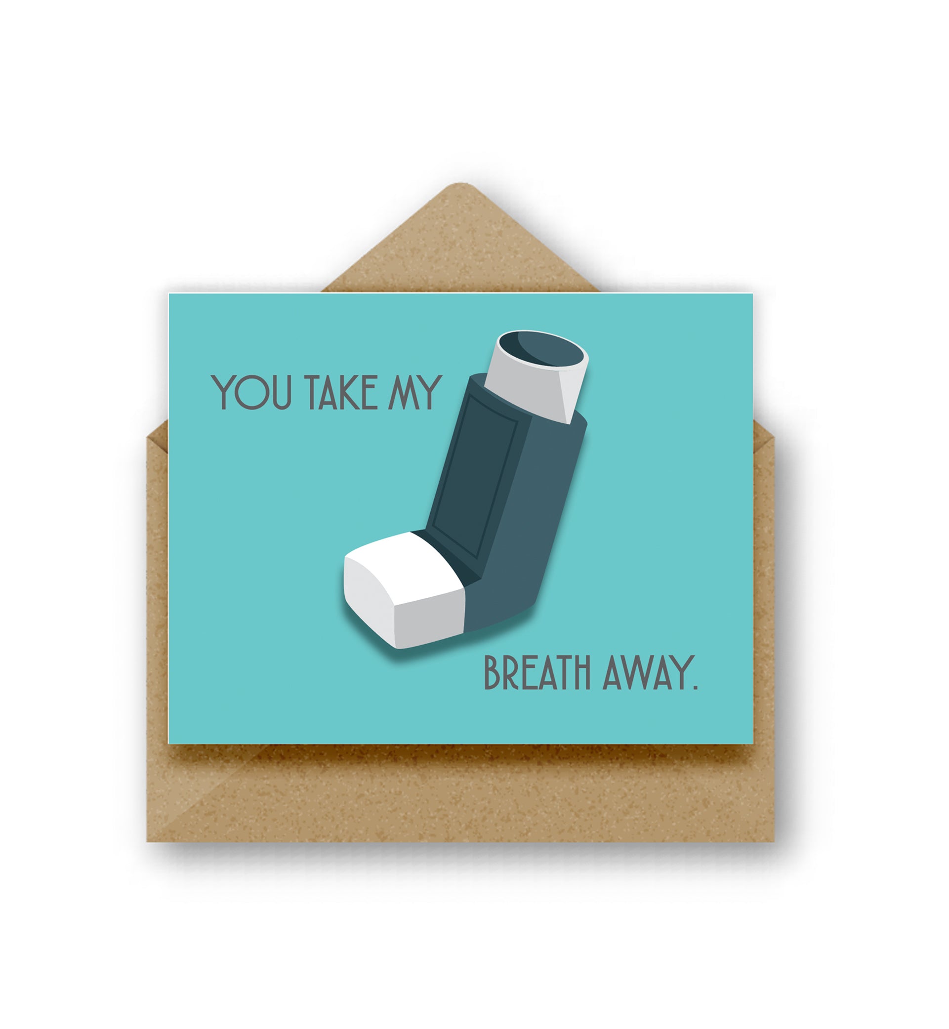 Breathe some humor into your love life with our You Take My Breath Away greeting card. Featuring a playful illustration of an inhaler paired with a clever pun, this card is the perfect way to express your feelings with a touch of wit.Β